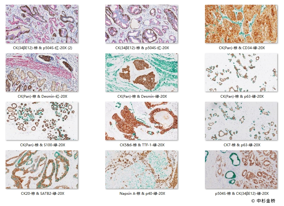 中杉金桥全新推出国内领先水平的全自动免疫组化双染试剂盒,提供了更清晰的对比效果和更灵活的搭配,支持多种一抗组合,并采用分步法技术,确保染色效果的清晰度与稳定性。特别是全新的绿色标记与棕色显色搭配,使得染色对比分明,判读更加容易。