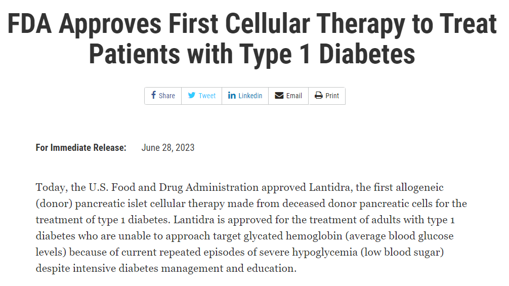 就在6月28日,美国FDA批准了首个针对I型糖尿病患者的细胞疗法上市!这是CellTrans公司开发的同种异体胰岛细胞疗法——Lantidra,被批准用于治疗即使接受强力糖尿病治疗和教育,仍然由于严重低血糖的反复发作,无法达到目标糖化血红蛋白水平的I型糖尿病成人患者。